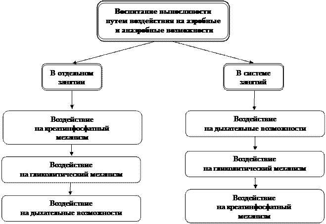 Воспитание выносливости путем воздействия на анаэробные возможности основано на приспособлении организма к работе в условиях накопления недоокисленных продуктов энергетического обеспечения и характеризуется решением двух задач: 1) повышение мощности гликолитического (лактатного) механизма; 2) повышение мощности креатинфосфатного (алактатного) механизма. Для этого используются основные и специально подготовительные упражнения соответствущей интенсивности. При этом применяются методы повторного и переменного интервального упражнения.
