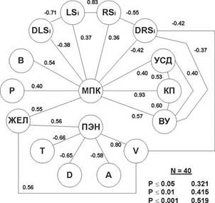 МПК - максимальное потребление кислорода; КП - кислородный пульс; ВУ - время удержания максимальной физической нагрузки; ЖЕЛ - жизненная емкость легких; Р - рост; В - вес; ПЭН - коэффициент психоэнергетики; T, D, A, V - факторы теста "POMS" (см. текст).