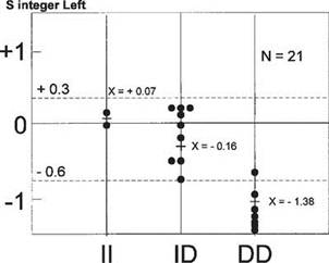 II; ID и DD - генотипы АПФ, по ординате - энергетические уровни ВЭЭП по LS integr. Позиции испытуемых обозначены точками, n = 21. Зона нормальной биоэнергетики (от +0,3 до -0,6) обозначена пунктирными линиями