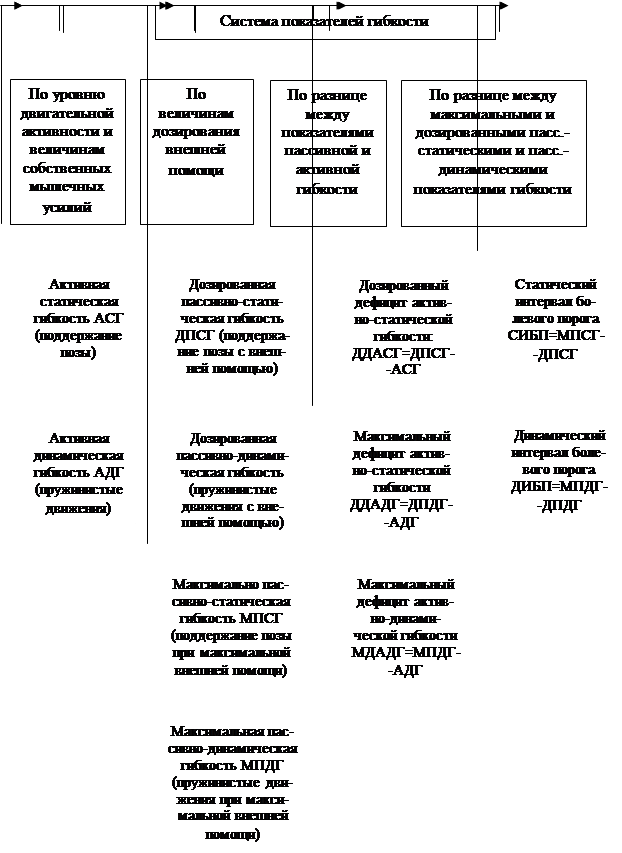 Методы измерения гибкости в настоящее время нельзя признать совершенными. На это есть серьезные причины. В научных исследованиях ее обычно выражают в градусах, на практике же пользуются линейными мерами. Различают следующие виды гибкости – активную, пассивную, активно-динамическую. Активная гибкость имеет место, когда движение выполняется за счет силы мышц-антагонистов движения, пассивные движения осуществляются в результате действия посторонних сил. Активно-динамическая гибкость – это гибкость, проявляемая в движениях.
