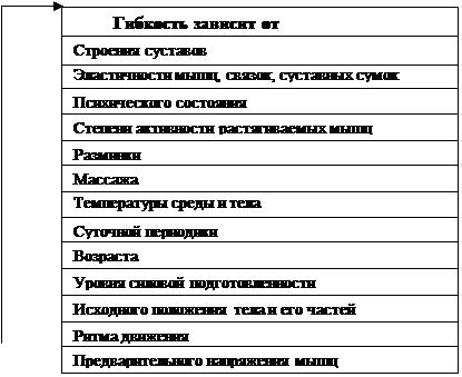 Зависит гибкость от многих факторов и, прежде всего, от строения суставов, эластических свойств связок и мышц, а также от нервной регуляции тонуса мышц. Также она зависит от пола, возраста, времени суток (утром гибкость снижена) (рис. 3).