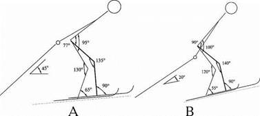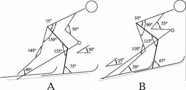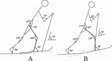 Рис. 1. Контурограмма "маятникового" хода лыжника-ориентировщика в первой фазе движения: А - на подъеме крутизной 5?; В - на подъеме крутизной 12?