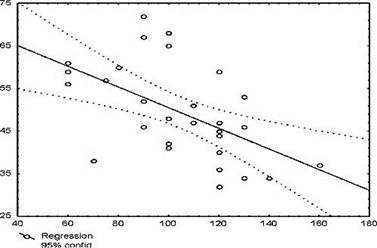 Рис.1. Зависимость тканевого напряжения кислорода от продолжительности задержки дыхания в экспериментальной группе. По оси абсцисс - продолжительность МПЗД (к). По оси ординат - напряжение кислорода (мм рт. ст.)