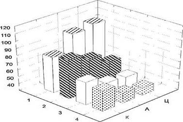 Рис. 2. Показатели рО2, HbO2 и длительность пробы в контрольной и экспериментальных группах. 1 - продолжительность МПЗД, с; 2 - содержание оксигемоглобина, %; 3 - тканевое напряжение кислорода на пике МПЗД, мм рт. ст.; 4 - минимальный уровень тканевого напряжения кислорода, мм рт. ст; К - контрольная группа испытуемых, А - группа испытуемых - представителей ациклических видов спорта; Ц - группа испытуемых - представите лей циклических видов спорта