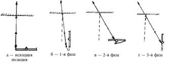 При использовании резиновых жгутов (пружин), противовесов, соединенных через тросы на блоках, закрепленных к жесткой опоре, силовое воздействие на пружину (резину, трос с противовесом) при проворачивании всегда направлено вдоль троса (рис. 5). При этом противоусилия с троса, как правило, не копируют противоусилий, которые возникают при воздействии на тело противника в каждой фазе броска проворотом. Особенно это несоответствие проявляется при приложении усилий через горизонтально натянутый трос (рис. 6).