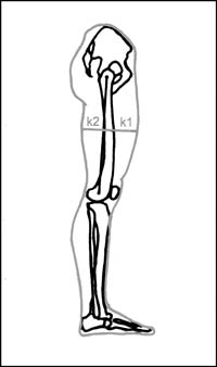 Антропометрия. Измерялись антропологические показатели: обхваты правого и левого бедра, а также обхваты правого и левого плеча. Все показатели оценивались при расслабленном состоянии мышц. Кроме этого определялись параметры К1 и К2 на бедре и плече (рис. 1).