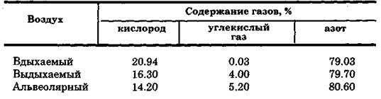 Механизм газообмена в легких состоит в том, что во время вдоха атмосферный воздух поступает в легкие и в альвеолах смешивается с оставшимся в них после выдоха воздухом (этот воздух, даже при самом интенсивном выдохе, не позволяет легким спадать). Поступающий в легкие воздух отличается по своему составу от воздуха в альвеолах (табл. 2.3).