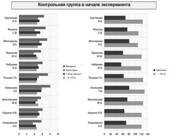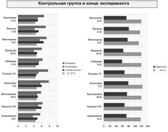 Как видно из таблиц и рисунков, показатели гемоглобина в контрольной группе, где проходили занятия только оздоровительными упражнениями, практически не изменились. Средние показатели крови в контрольной группе приведены в таблице 3. Изменения были незначительны. По таблице видно что сахар мочевина и креатинин повысились, что с связано с незнанием правил грамотного питания и соблюдения.