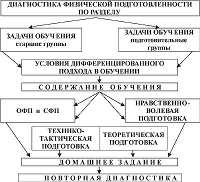 Каждый из 11 разделов программы начинается с диагностики (оценки реального уровня готовности детей к овладению данным видом двигательной деятельности) и заканчивается диагностикой (оценкой достигнутых в обучении результатов), то есть взаимоотношения управляющей и управляемой подсистем планируют на основе объективной информации об основных параметрах физического состояния управляемой подсистемы.
