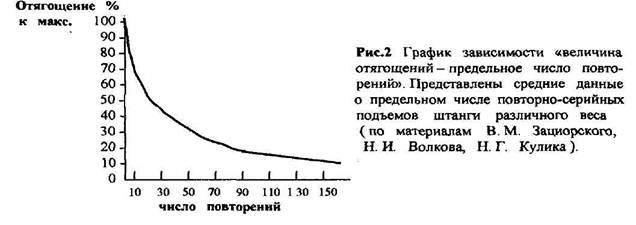 В принципе соотношение объема и интенсивности нагрузки при выполнении физических упражнений характеризуется обратнопропорцио-нальной зависимостью: чем больше объем нагрузки, задаваемой в упражнении, тем меньше ее интенсивность, и наоборот, чем больше интенсивность нагрузки, тем меньше ее объем. Это соотношение хорошо видно на графике, выражающем связь между возможным числом повторений с отягощением и величиной отягощения (рис. 2).