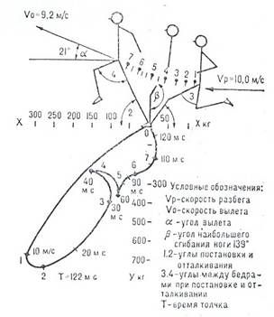 Угол наклона толчковой ноги, степень её сопротивления при амортизации сгибанию в суставах и активность разгибания определяют продолжительность и направление развиваемых усилий при отталкивании при одной и той же скорости разбега.
