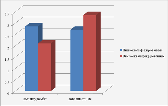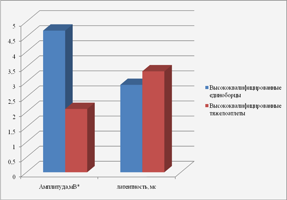 2. У спортсменов каратистов высокой квалификации в сравнении с начинающими спортсменами отмечается увеличение амплитуды М-ответа и снижение латентного периода.
