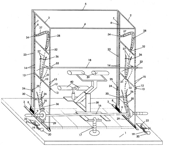 В каждой направляющей 26, 27 сделаны соосные отверстия 35 для установки в них стопоров движений 36, а в направляющих 28 - окно для установки в них грифа 16 штанги. При установке щитов (не показан) с вырезанными в них полными эталонными траекториями движения штанги в соревновательных упражнениях направляющие 26, 27, 28 снимаются, поперечины 10, 11 закрепляются в раме 2 в крайне верхнем положении, а щиты устанавливаются в рамах 2 при помощи высвободившихся ползунов 30, 32 с фиксаторами. При этом к ползунам 32 приварены держатели грифа 18 спортивной штанги для выполнения приседаний с ней. Кроме того, блок снабжен разборными подставками (показаны пунктиром) под диски штанги для установки тяжелых грузов и выполнения тяг. Блок размещения спортсмена содержит конструируемые на основании 1 между рамами 2 разборное возвышение (показано пунктиром) для размещения атлета стоя, составленное из плит одинакового размера с плитами подставок, и опору для размещения атлета сидя и в наклоне, состоящую из вертикальной опорной рамы 38, несущей симметрично установленные в ее противоположных сторонах (с возможностью регулирования их положения и фиксации) валики 39 для размещения туловища и валики 40 для закрепления голеней и стоп атлета.