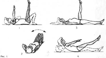 4. И. П. — лежа на спине, ноги согнуты, стопы на постели, пятки ближе к ягодицам, кисти рук к плечам. Выпрямите вверх ноги и руки, затем вернитесь в И. П. Повторите 6—8 раз в среднем темпе, не задерживая дыхания (рис. 1,1).