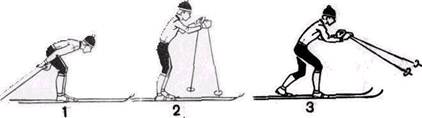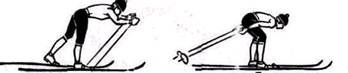 ном варианте. Сделав шаг, лыжник выводит палки из положения кольцами к себе в положение кольцами от себя, а оттолкнувшись ногой, он должен вновь расположить их кольцами к себе. Постановка палок на снег и отталкивание ими осуществляются под острым углом. Весь период от окончания отталкивания руками до начала следующего отталкивания ими значительно продолжительнее, чем в скоростном варианте.