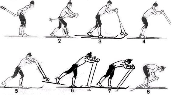 Цикл одновременного двухшажного хода состоит из двух скользящих шагов, одновременного отталкивания руками и свободного скольжения на двух лыжах.