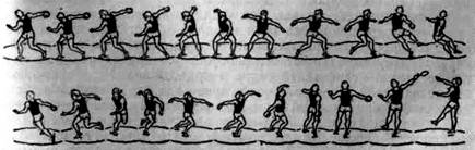Для повышения скорости поворота метатель может использовать поочередное отталкивание ногами и выведение правой ноги махом вперед в фазе опоры. Казалось бы, что скорость вращения целесообразно увеличить и махом правой руки с диском влево вместе с быстрым вращением плечевого пояса при входе в поворот. Однако при опережающем движении руки в повороте исчезает натяжение мышц, нарушающее целостность системы «метатель – снаряд», и метатель оказывается в невыгодном для финального усилия положении. Все это ухудшает управление диском и эффективность выполнения финального усилия. Нельзя стремиться выполнять очень быстрый поворот плечевого пояса независимо от положения руки с диском. В этой фазе важна не скорость вращения плечевого пояса, а скорость всей системы «метатель – диск».