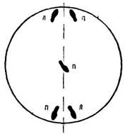 Левая нога ставится на грунт у передней части круга передней частью внутренней стороны стопы. Следы ног (левой при исходном положении, правой и левой в положении для финального усилия) находятся почти на одной линии, если правая нога ставится в центре круга (рис. 3). При отталкивании правая нога поворачивается до направления метания. В это время метатель, напрягая мышцы живота, не должен прогибать туловище назад. Следует избегать распространенной ошибки, заключающейся в поспешном и чрезмерном вращении правой ноги в момент опоры на грунт.