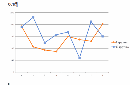 контрольная группа с 140,8 до 137,2 (-3,6 сек.) экспериментальная группа с 123,2 до 161,3 (+38,1 сек.)