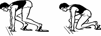 По команде "На старт!" (рис 1 а) учащийся становится впереди стартовых колодок и опускается на руки впереди стартовой линии, плотно устанавливает ногу на опорную площадку задней колодки. Опускается на колено сзади стоящей ноги, устанавливает руки перед линией старта. Прямые ненапряженные руки расставлены на ширину плеч. Туловище выпрямлено, плечи находятся над стартовой линией, голова опущена и служит продолжением туловища.