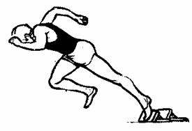 По команде "Марш"! бегун, отрывая руки от дорожки, отталкивается от колодок. Нога, стоящая сзади, отрывается от колодки первой и энергично выносится бедром вперед и несколько внутрь. Стопа держится невысоко от земли, что позволяет сократить ее путь от колодки до места постановки за стартовой линией (рис 2).