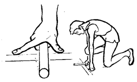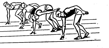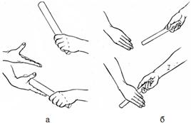 Наиболее экономичный и эффективный способ передачи эстафеты – "без перекладывания" и с передачей "снизу". Ученик, бегущий на первом этапе, держит эстафетную палочку в правой руке и передает второму бегуну в левую руку. Второй бегун передает третьему из левой руки в правую, и, третий четвертому опять из правой в левую. Для удобства передачи (чтобы дать место передающему) на своей дорожке бегуны на вираже должны бежать в внутреннего края дорожки, а бегуны на прямых – у наружного. Способ держания эстафетной палочки при низком старте показан на рис. 8.