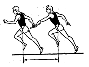 В этот момент бегуны находятся друг от друга на расстоянии вытянутых рук 1 – 1,3 м. При передаче принимающий должен точно фиксировать свою кисть сзади туловища, а передающий точно вложить эстафетную палочку в раскрытую ладонь принимающего.