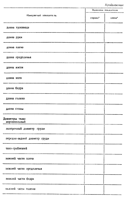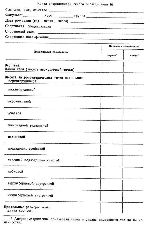По антропометрическим данным расчётным путём (аналитическим методом) определяют поверхность тела, костный, жировой и мышечный компоненты веса тела (расчёты приводятся в соответствующих главах). Данные антропометрического обследования заносятся в специальные карты (см. далее).