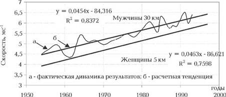 Историографический анализ динамики спортивных результатов сильнейших лыжников-гонщиков мира (элиты) в конкретных видах соревновательных программ чемпионатов мира (ЧМ) и олимпийских игр (ОИ) (средняя скорость спортсменов, занявших первые 6 мест) свидетельствует о том, что наряду с существенной вариативностью результатов присутствует общая прогрессирую щая тенденция лучших мировых достижений. Ежегодный рост спортивного результата, достигаемого спортсменами, входящими в международную "элиту", составляет в среднем около 1% (рис. 1).