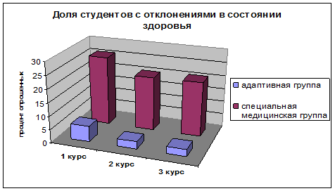 В настоящее время значительно сократилось количество практически здоровых студентов. Хроминой и Шумаховой было проведено исследование состояние здоровья студентов различных курсов на базе ХГАЭиП. В исследовании приняло участие 331 студент (57,8% первокурсников, 69,1% второкурсников и 60,7% третьекурсников) [50]: