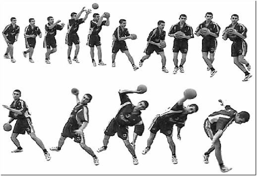 Объяснение техники броска и показ сделанных самостоятельно с помощью видеосъемки и компьютерной обработки материалов наглядных пособий (рис.1), а также - видеокассет с записью техники выполнения бросков гандболистами-профессионалами (производство Калифорнийского Университета). Просмотр видеокассеты производился 2 раза в месяц. Наглядные пособия (рис. 1) выдавались каждому ученику для детального изучения дома на неограниченный срок. При подготовке наглядного пособия приглашались спортсмены высших разрядов (не ниже первого), отбирались наиболее удачные материалы. На рисунке 1 показано выполнение броска спортсменом - студентом ХДПУ (кмс).