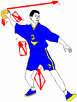 При этом ученикам детально объяснялось правило сложения сил по векторам (6-7 классы общеобразовательной школы). После чего приводились примеры сложения сил по векторам. Среди данных примеров была демонстрация правильной техники передачи мяча в гандболе, при которой должны работать все мышцы, и в первую очередь - ноги, так как это наибольшая векторная составляющая в сумме действующих сил в данном движении. Таким образом, мышцы, правильно включаясь в движение, создают силу, которая способствует точному и сильному посыланию мяча в цель (рис. 2). Эта сила является результатом сложения всех векторов сил, обеспечивающих данное движение. Поэтому при передаче мяча обязательно должны работать все мышцы. Это актуально с той точки зрения, что наиболее распространенной ошибкой у начинающих гандболистов является стойка на прямых ногах при передачах и бросках мяча. При этом теряется возможность не только скоростно-силового компонента движения, но и возможность сильной и точной передачи.