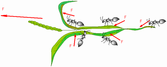 В качестве аналогии из живой природы приводился пример совместного перетаскивания муравьями ноши, когда складываются вектора сил действия всех муравьев (рис. 2). Как муравьи могут быстро перетащить ношу в нужное место только сложив свои усилия, так и мышцы могут выполнить сильное и точное действие, работая согласованно. С этой точки зрения также целесообразно сгибать ноги при передачи мяча, так как при этом в действие включаются наиболее крупные мышцы, которыми являются мышцы нижних конечностей, что обеспечивает скоростно-силовой аспект при выполнении данного приема.