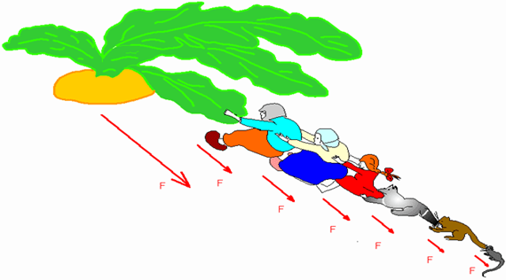 В качестве усиления обучающего эффекта применяли наглядные пособия, аналогичные представленным на рис. 1. Кроме того, на уроках информатики, геометрии, биологии ученики просматривали учебный мультфильм, в котором проводилась аналогия в правиле сложения векторов между законами биомеханического сложения сил при выполнении передачи мяча, законами взаимодействия сил у муравьев при перетаскивании ноши и законами сложении сил при любом коллективном однонаправленном действии на примере сказки "Репка" (рис.2).