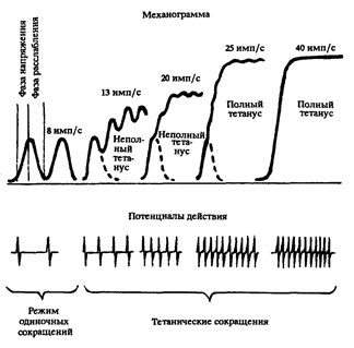 Рис. 5. Режимы сокращений двигательной единицы импульсами различной частоты (по Я. Коцу).
