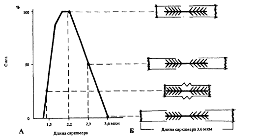 Рис. 7. Зависимость между силой сокращения, длиной саркомера и степенью перекрывания актиновых и миозиновых нитей: А - зависимость между максимальной изометрической силой, развиваемой саркомером во время тетануса и его длиной; Б - взаимное перекрывание актиновых и миозиновых нитей при различной длине саркомера (по Gordor A. M. и др., 1966, переработано).