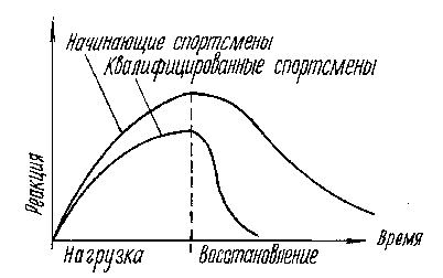Иллюстрация 8 показывает, что одна и та же нагрузка вызывает более глубокие сдвиги в организме начинающих спортсменов. В свою очередь восстановление занимает у этих спортсменов более длительный период времени, чем у квалифицированных атлетов. Это одна из основных причин, по которой начинающим заниматься атлетизмом рекомендуется тренироваться 2—3 раза в неделю (1,6). При увеличении количества тренировок в недельном цикле возможны случаи недовосстановления, что может привести к перенапряжению.