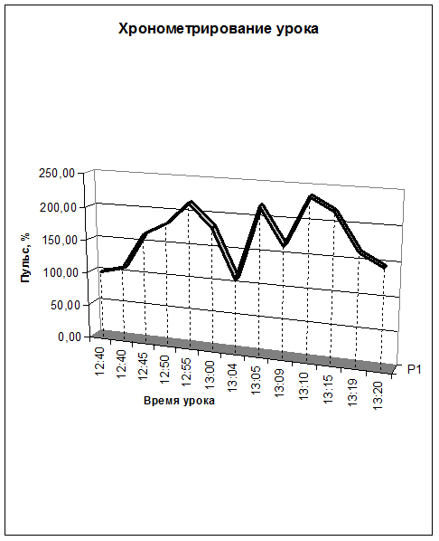 По данному измерению мы видим, что урок прошел умеренно, с большим временем отдыха, что приемлемо для организма человека. Нагрузка на организм небольшая. Общим для этих нагрузок является их основная задача - подготовка организма к последующей деятельности. Однако содержание этих нагрузок существенно различно в зависимости от частных задач.