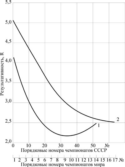 Данные об изменении результативности в футболе за весь период проведения чемпионатов СССР (1936 - 1991 гг.) и финальной части чемпионатов мира за период с 1930 по 2002 г. (между 1938 и 1950 гг. в силу известных причин чемпионаты мира по футболу не проводились) представлены на графике рис. 1, по оси абсцисс которого отложены порядковые номера чемпионатов СССР и мира (N), а по оси ординат - результативность (R). При этом кривые 1 и 2 характеризуют усредненное изменение результативности чемпионатов СССР и чемпионатов мира соответственно.