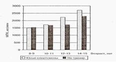 Мощность выполняемой работы увеличивается с 11 до 16 лет более, чем на 200 % (для сравнения – увеличение мощности работы с 7 до 11 лет составляет всего 30%). Объем выполненной работы максимальной мощности повышается по сравнению с 7-летним возрастом в 10 лет на 50%, а в14-15 лет – на 300-400%.
