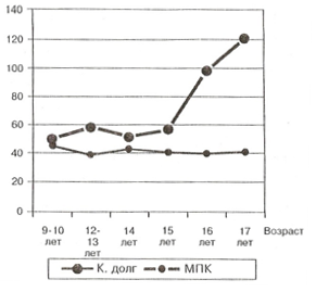 Однако, экономичность и эффективность их работы еще не достигают взрослых значений. КПД работы, выполняемой на уровне МПК, в14-15 лет составляет всего 65-70% взрослого уровня, а процесс восстановления значительно более длительный. У юношей 17-и лет длительность восстановления в 2 раза превышает время восстановления у 20-летних при той же выполненной работе.