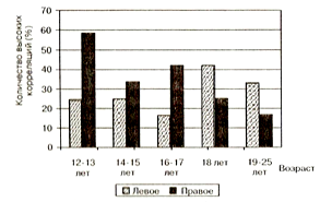 Рисунок 4.Возрастная динамика участия разных зон левого и правого полушария в управлении движениями (модиф. по: Сологуб Е.Б., Капустин В.С., 1986)