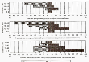 Начиная с возраста 13-15 лет, участие ассоциативных третичных полей в управлении движениями отражается в ЭЭГ юных спортсменов достоверным увеличением взаимосвязи активности моторных центров рук и ног с задними нижнетеменными областями (зонами афферентного синтеза и пространственной ориентации движений) и передними лобными областями, ответственными за программирование и контроль движений.