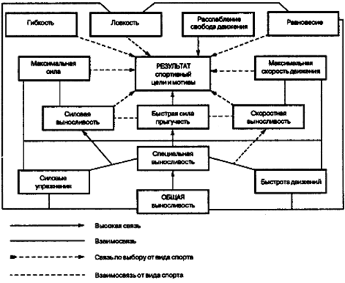 Рис. 6 Условная схема связей физических качеств (при достижении спортивных результатов, укреплении здоровья)