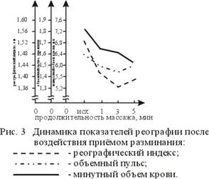 Таким образом, в результате исследования влияния различных приемов массажа на кровообращение в мышце было выявлено, что, воздействуя различными приемами массажа, можно влиять на кровообращение массируемой области. По нашим данным [1], функциональное состояние скелетной мускулатуры может изменяться в зависимости от приема массажа. Наиболее приемлем при подготовке спортсмена к старту прием растирания, который в короткий промежуток времени (в течение 1 мин) способен вызвать увеличение показателей гемодинамики и амплитуды тонуса массируемых мышц. Это особенно важно при подготовке пловца к старту, когда время ограничено.
