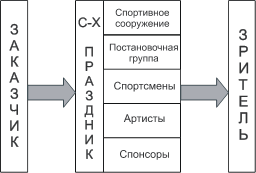 2) собственно праздника, который проводят те, кто создает, воплощает идеи заказчика (постановочная группа, спортсмены и артисты со своими новейшими технологиями, спортивные сооружения, спонсоры);