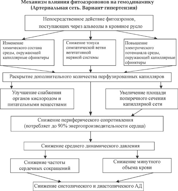 Результат. Минутный объем крови снижается, обеспечивающая минутный объем крови энергопро изводительность сердца также уменьшается, а качество кровоснабжения органов и тканей возрастает в результате улучшения микроциркуляции крови. Поскольку среднее динамическое давление - величина, функционально связанная с АД, понижение среднего динамического давления в представленном варианте вызывает понижение АД. Итог: снижение АД и ЧСС явилось не результатом непосредственного действия фитоаэроионизации на эти параметры гемодинамики, а заключительным звеном в целой цепи последовательных изменений, приведших к оптимизации кровоснабжения органов и тканей при одновременном снижении энергопроизводительности сердца.