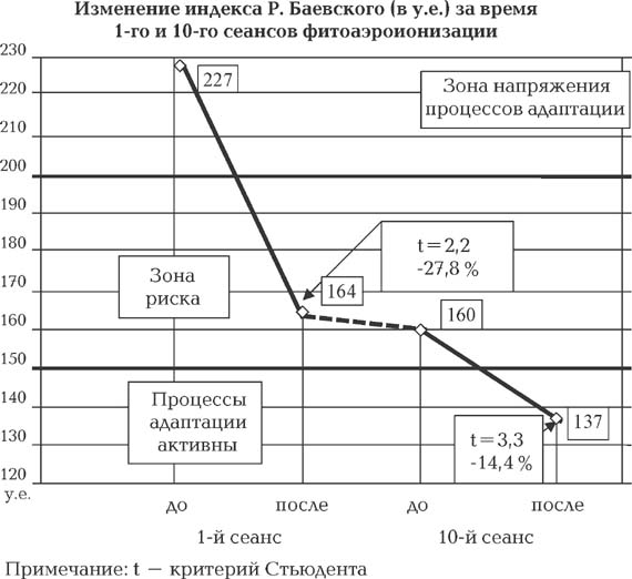 Ранее обсуждался вопрос о снижении тонуса симпатической ветви вегетативной нервной системы. Но тонус симпатической ветви не может быть повышенным при нормальном напряжении ветви вагуса. Как только возрастает тонус симпатикуса, вагус также немедленно реагирует своим напряжением. Поэтому при напряжении симпатической ветви обязательно происходит напряжение всей вегетативной нервной системы. Мы обсуждаем проблемы, связанные с отдыхом, т.е. с возвратом напряженной вегетативной системы к норме или хотя бы приближением к ней за время отдыха. Эту часть хорошо иллюстрирует изменение индекса Р. Баевского, который точно определяется при проведении исследований методом кардиоинтервалометрии. Эту часть мы изучали подробно, но приведем только данные по изменению индекса Р. Баевского на 1-м и 10-м сеансах фитоаэроионизации .