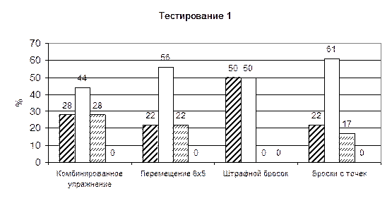 Все результаты тестирования подверглись статистической обработке по критерию t – Стьюдента. Контрольные тесты: «комбинированное упражнение», «штрафной бросок», «броски с точек», «перемещение 6х5» статистически достоверны. (Приложение 4). Ниже на рисунке 3 представлена диаграмма результатов исследования.