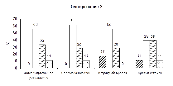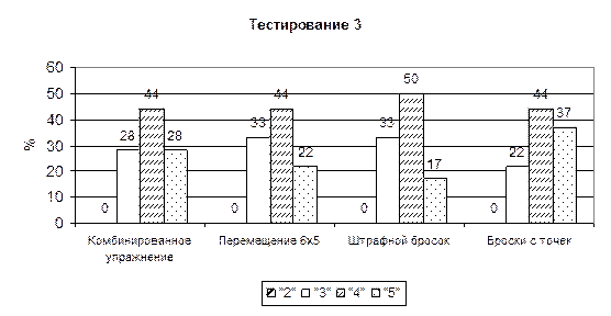 А на 3-й год обучения тренировки уже проходили по плану УТГ-3, но с меньшим количеством часов (6 часов вместо 10). В октябре 2002г. (второе испытание) – результаты контрольных испытаний улучшились. Оценку «5» - заработали 11% учащихся в таких тестах как «комбинированное упражнение», «перемещение 6х5» и «броски с точек». По сравнению с первым испытанием повысился процент положительных оценок и уменьшился процент отрицательных. Это соотношение можно проследить на гистограммах (рисунок 3). Низкую оценку учащихся получили только в контрольных испытаниях «штрафной бросок» и «бросок с точек».